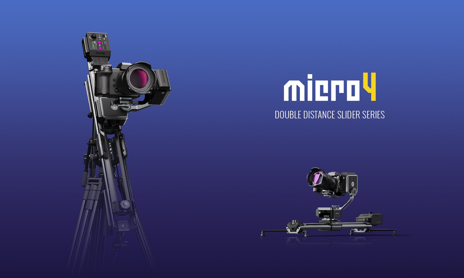 Micro4 is the latest advanced version of the Micro series camera sliders. Building on the success of the previous Micro2 and Micro3 models while adding improvements for greater performance, and stability. New features include dual rail design, higher payload capacity, high speed mode, updated user interface with lcd screen and integrated cable management.