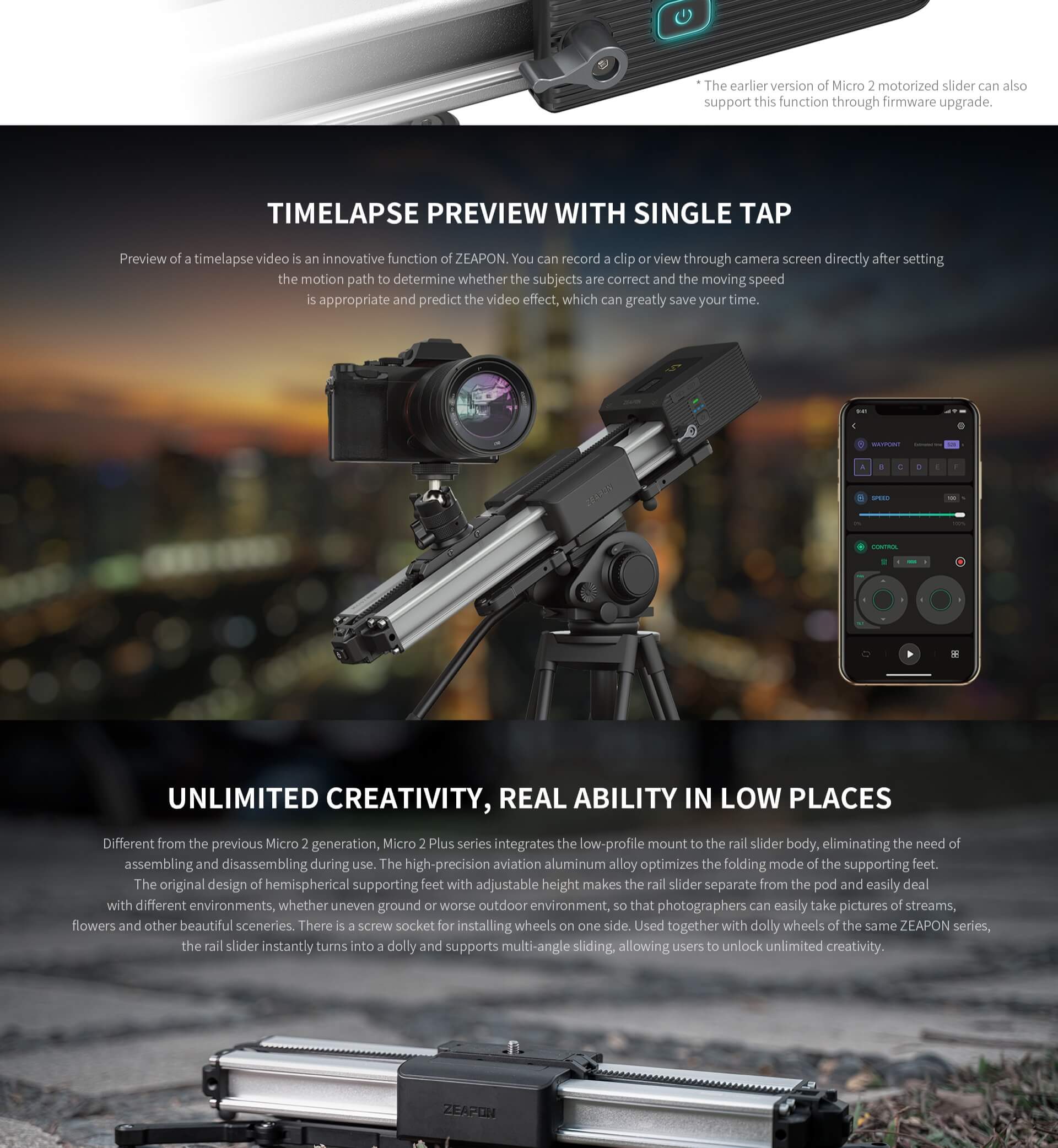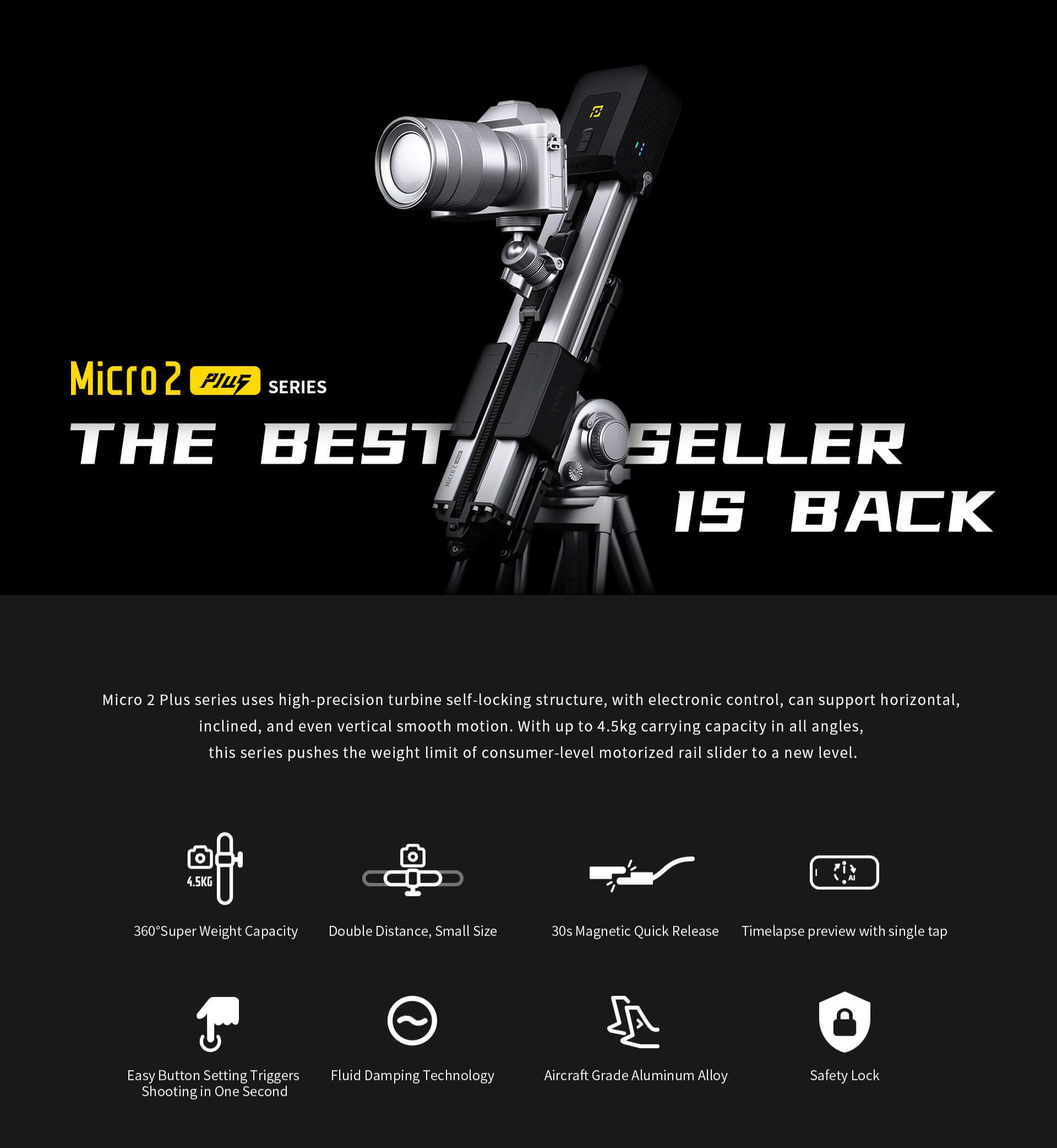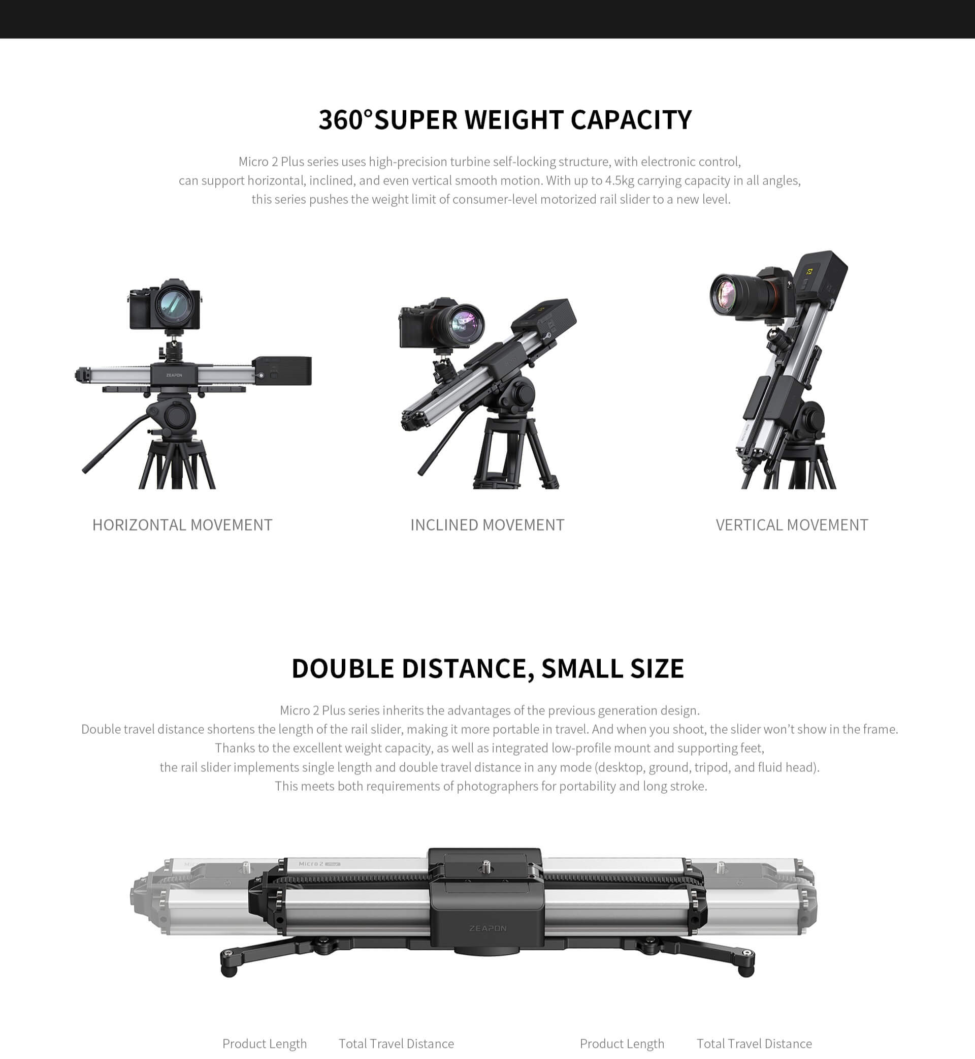 Micro 2 Plus series is the most affordable slider professional solution. This series is a complete upgrade of the original Micro2. Zeapon has been committed to making more intuitive support equipment to cinematographers with the cutting-edge technology and exquisite product details. The ultra-short and portable double travel distance design, smooth damping, and large motor load are still the best features of Micro2 Plus.